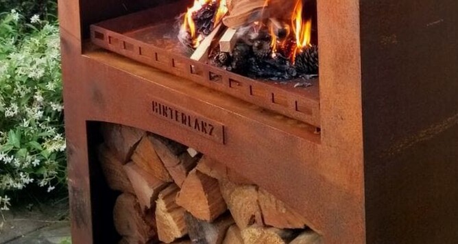 The Hinterlanz Fire is custom cut from Corten Steel sheets, which is a group of steel alloys that were developed to eliminate the need for painting, and form a stable rust-like appearance over time.